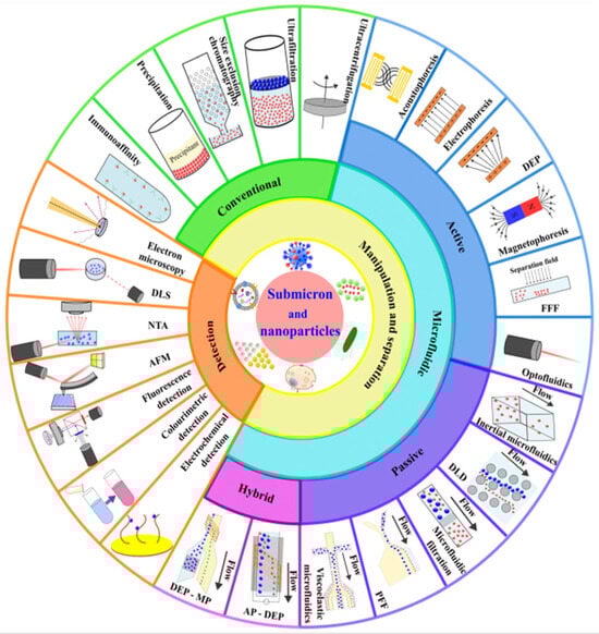 An overview of submicron and nanoparticle manipulation, separation, and detection techniques. Manipulation and separation can be mainly categorized as conventional and microfluidic technologies. Microfluidic technologies can be further subdivided into active, passive, and hybrid techniques according to the manipulating forces. Abbreviations are DEP (dielectrophoresis), FFF (field flow fractionation), DLD (deterministic lateral displacement), PFF (pinched flow fractionation), AP–DEP (acoustic–dielectrophoresis), DEP–MP (dielectrophoresis–magnetophoresis), AFM (atomic force microscopy), NTA (nanoparticle tracking analysis), and DLS (dynamic light scattering). (Reprinted with permission from [9]).