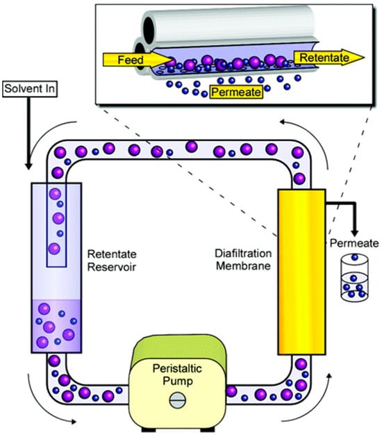 Sweeney et al. [33] state that diafiltration is a rapid and environmentally benign method for isolating and refining gold nanoparticles, ensuring the efficient production of very pure samples that may have wide-ranging applications in several domains (Figure 2). In a project examining diafiltration for nanoparticle separation, the impact of ultrafiltration membrane material on the precise separation of proteins from silica nanoparticles was analyzed. In addition, the work offered valuable information on the parameters for diafiltration, showing the efficient elimination of proteins while attaining a high level of silica rejection. A different study has shown that diafiltration is a successful technique for removing surplus peptide- and purifying peptide-conjugated gold nanoparticles. A cellulose ultrafiltration membrane yielded the most optimal purification outcomes. Diafiltration with a comparable membrane was proven to be more scalable and efficient than centrifugal filtration, indicating its promise as an effective purification method for peptide-conjugated gold nanoparticles [26].
