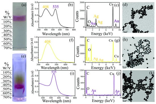 Characterization of dual core composition of silver plus gold nanoparticles before and after separation. (a) Photograph of mixed parent nanoparticles showing pale red color. (b) UV-Vis spectra of parent nanoparticles showing two peaks indicating presence of both AgNPs and AuNPs. (c) EDS of parent nanoparticles showing strong signals from AgNPs and AuNPs. (d) TEM images of parent nanoparticles showing their mixed monodispersities. (e) Images of differently dragged AgNPs and AuNPs in sucrose gradient after centrifugation, implying separation. UV-Vis spectrum of purified (f) AgNPs and (i) AuNPs with peaks at 408 nm and 525 nm, respectively. (g,j) EDS of purified AuNPs and AgNPs showing strong signals. (h,k) TEM images of purified AgNPs and AuNPs. (Reprinted with permission from [47]).
