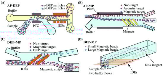 Microfluidic systems with cascaded combinations of active–active connections. (A) The combination of acoustic and DEP forces for particle washing and separation. Acoustic force enables particles to be transferred from a high-conductivity medium to low-conductivity medium. Then, particles are separated through the use of pDEP and nDEP forces generated by 3D sidewall electrodes. (B) An integrated acoustic–magnetic separation (IAMS) device offers the multi-parameter sorting of particles based on acoustic and magnetic properties. In the first stage, acoustic radiation force repels the acoustic and magnetic target particles quickly away from the sidewall and filters out nontarget particles. In the second stage, the magnetic targets are deflected further away by magnetic force and separated from the acoustic targets. (C) A multi-parameter separation device with DEP and magnetic forces. Target cells with DEP tags are first deflected along an angled electrode in the DEP separation unit. Then, microfabricated nickel ferromagnetic strips trap the magnetically labelled targets. Also, nontarget cells flow out from the outlet. (D) An integrated multiplex detection system with DEP and magnetophoresis for sorting magnetic beads of different sizes. Magnetic beads with various sizes experience different p-DEP or n-DEP forces and are confined in varied vertical locations in the DEP region. Then, a downstream disk magnet array trapped these magnetic beads in different horizontal locations. (Reprinted with permission from [69]).
