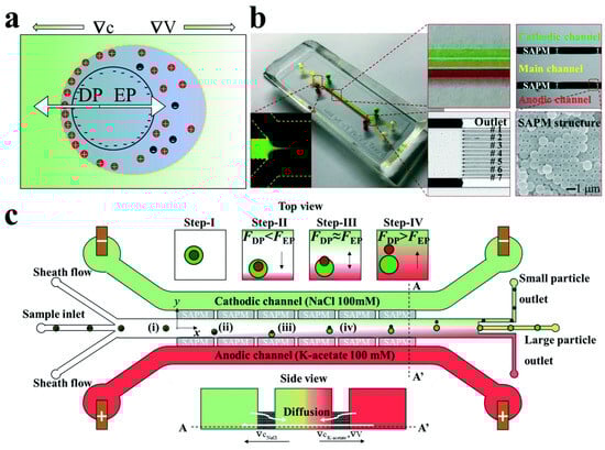 The theory, design, and fabrication of the microfluidic nanoparticle separation device and the working principle of the LEPDP-based separation device. (a) The theory of DP and EP of charged nanoparticles. (b) A picture of the fabricated microfluidic device. Optical, fluorescence, and SEM images show the essential components of the device. (c) The working principle of the device for nanoparticle separation. The main channel at the center is filled with a nanoparticle suspension and the two side channels are filled with 100 mM NaCl (upper, cathodic) and K-acetate solutions (lower, anodic), respectively. The three microfluidic channels are connected by a series of self-assembled particle membranes (SAPMs), which are shown in the optical and SEM images in (b). The mechanism of nanoparticle migration can be divided into four steps. Nanoparticles are focused on in the center of the main channel by sheath flows (Step-I). They move toward the anodic channel side due to the external electric field applied across the SAMPs (Step-II). Their migration direction continues to change along the main channel (Step-III). The separated nanoparticles are fractionated at the downstream junction and then individually extracted for an off-chip analysis at the outlets (Step-IV). (Reprinted with permission from [70]).