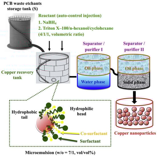 A designed production process of copper nanoparticles for industrial PCB waste etchant recycling via a microemulsion method. (Reprinted with permission from [87]).