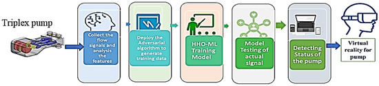 - Stage 4: (Training/Testing the proposed model): At this point, the data generated in phase one are used to train an effective ML model that diagnoses the fault of the optimized ML methods to organize all the input data generated from the digital twin model. Then, the HHO technique is applied to enhance the performance of the machine learning algorithm. Finally, the data collected in real-time digital twins of machinery data are used to test different machine learning algorithms. Therefore, the performing assessment indices are applied to assess the suggested framework.