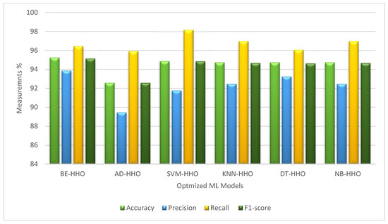 The BE-HHO shows slightly higher performance than BE, with an accuracy of 95.24% compared to 95.17%, and similarly high precision, recall, and F1-Scores. AD-HHO and AD have a notable difference in accuracy, with AD-HHO at 92.57% and AD at 92.06%, though AD achieves higher recall. The SVM-HHO variant exhibits an accuracy of 94.86%, slightly higher than the classical SVM at 94.48%, with both showing high recall values. KNN-HHO surpasses KNNs in accuracy (94.73% vs. 93.14%) and demonstrates improved precision and recall. DT-HHO and DT both have an accuracy of 94.73%, but DT-HHO has marginally better precision and recall. NB-HHO and NB are almost equivalent, with NB-HHO having a slightly higher accuracy of 94.73% compared to 94.6%. Overall, the optimized algorithms demonstrate marginal but consistent improvements over their classical versions in most metrics, as clarified in Figure 12.