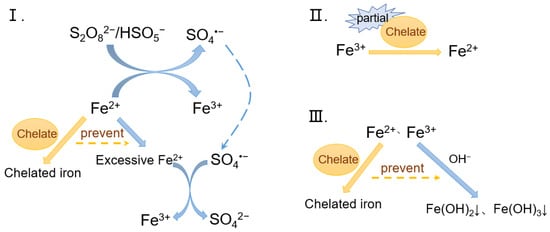 Mechanism of chelating agent for PS/Fe(II) system improvement. (I) Control of excess Fe(II); (II) Reduce Fe(III) to Fe(II); and (III) Inhibit Fe precipitation.