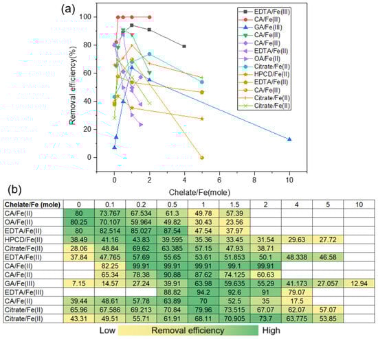 Target pollutants’ removal efficiency (%) as a function of the molar ratio of chelate/Fe (Reference # is based on the References in the Supplementary Materials [28,43,44,46,47,48,57,61,62]) plotted as scatter charts (a) and a heatmap (b). Chelating agents: ethylene diamine tetraacetic acid (EDTA), citric acid (CA), gallic acid (GA), oxalic acid (OA), hydroxypropyl cyclodextrin (HPCD), citrate.