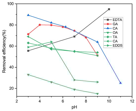 The correlation between target pollutant removal efficiency (%) and initial solution pH in the cases with the presence of varied chelating agents [28,43,55,58].