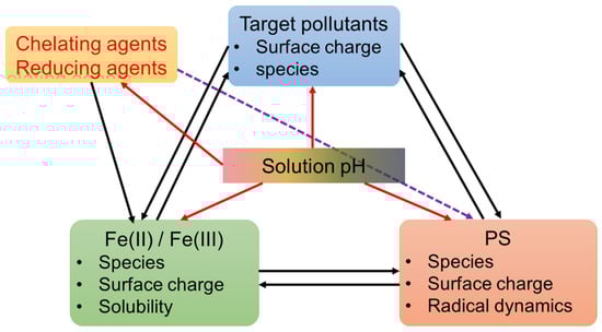 The mechanisms of how solution pH influence the PS/Fe(II) system for pollutant removal with the presence of chelating or reducing agents.