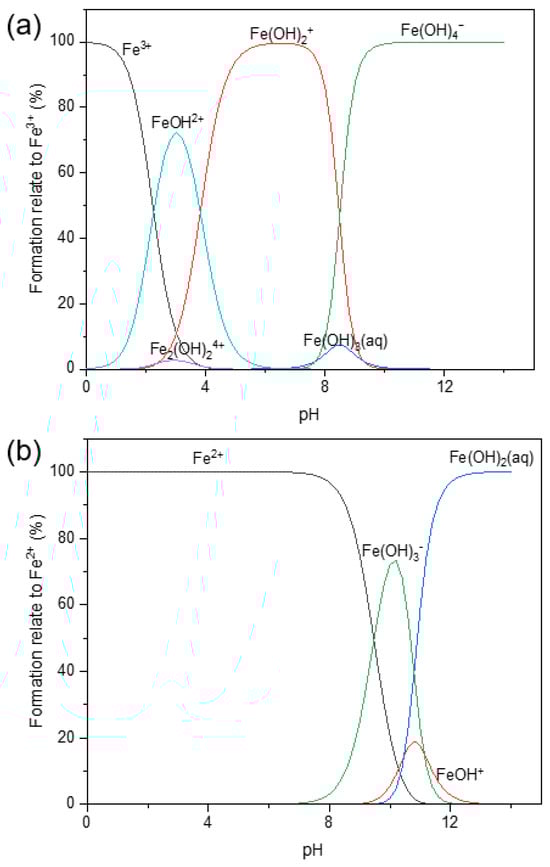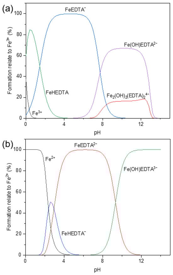 (a) EDTA/Fe(III) and (b) EDTA/Fe(II) complexes’ speciation diagram with the presence of EDTA at an EDTA/Fe molar ratio of 1.
