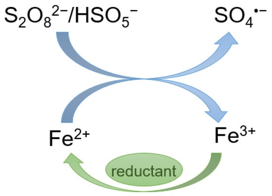 The mechanisms of adding reducing agent for PS/Fe(II) system is straightforward. During the activation of PS using Fe(II), Fe(II) itself is oxidized to Fe(III) (Figure 7). The addition of a reductant can directly convert Fe(III) to Fe(II), allowing it to continue activating PS. This process realizes the Fe(II)-Fe(III) cycle, ultimately enhancing the overall reactivity of the PS/Fe(II) system and the removal efficiency of target pollutants [65].