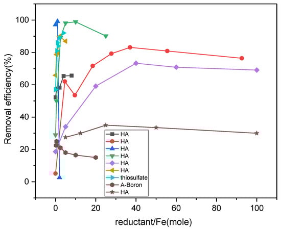 Figure 8 shows the correlation between the removal efficiency of target pollutant (%) and the molar ratio of the reducing agent/Fe. So far, to the best of our knowledge, HA, thiosulfate and amorphous boron (A-Boron) [66] are all reducing agents used for the improvement of the PS/Fe(II) system. Like the trend found for chelating agents in Figure 2, these removal efficiency data primarily exhibit an initial rise followed by a decline as the molar ratio increases [67]. In most of the cases, the peak removal efficiencies roughly correspond to molar ratios between 0 and 10.