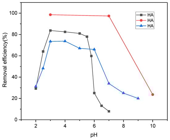 Analogous to chelating agents, the solution pH governs the distribution of HA, Fe(II), and Fe(III) species, along with the self-decomposition kinetics of PS. Figure 9 illustrates the removal efficiency of target pollutants in relation to the initial solution pH. The data present an upward trend in removal efficiency with an increase in pH, reaching a plateau at pH 3–5, followed by a sharp decrease at pH above 6.