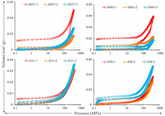 The curves for mercury intrusion and extrusion in coal effectively illustrate the characteristics of its pore structure. Different curve types represent different pore structures. The mercury intrusion and extrusion curves of the coal samples in the study area resemble a double-arc shape [48], with both the intrusion and extrusion curves exhibiting concave arc shapes (Figure 2). Based on the mercury intrusion and extrusion curves, the volume of intruding mercury changes only slightly when the intrusion pressure is below 30 MPa, and the amount of mercury intrusion changes very gradually. This stage of mercury intrusion is related to certain macropores and microcracks [48]. When the mercury intrusion pressure exceeds 30 MPa, the amount of mercury intrusion increases significantly, resulting in a rapid increase. This stage of mercury intrusion is associated with mesopores and some macropores. Especially at the maximum intrusion pressure of 413 MPa, the amount of mercury intrusion continues to increase, indicating the possible presence of pores in the coal samples with diameters less than 3 nm, which can be characterised via gas adsorption methods. Based on the degree of closure of the intrusion and extrusion curves, most of the coal samples from the Benxi Formation in the study area have relatively small pores, with some samples showing nearly overlapping intrusion and extrusion curves (Figure 2), suggesting that the pores in the Benxi Formation coal samples in the study area are mostly open or have well-developed microfractures.
