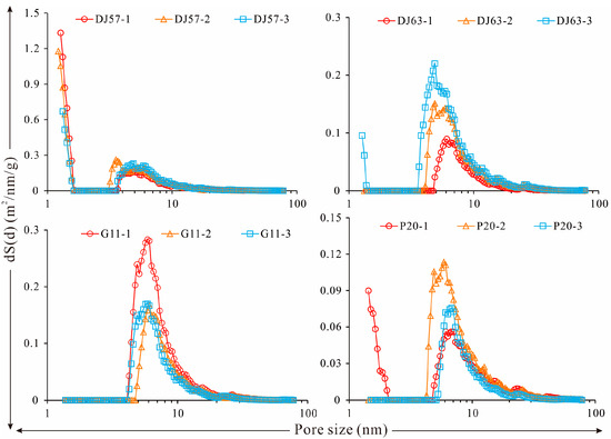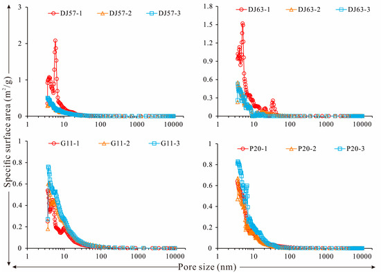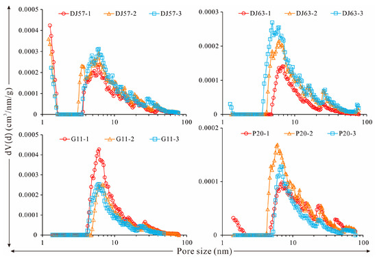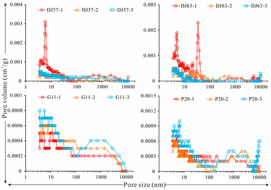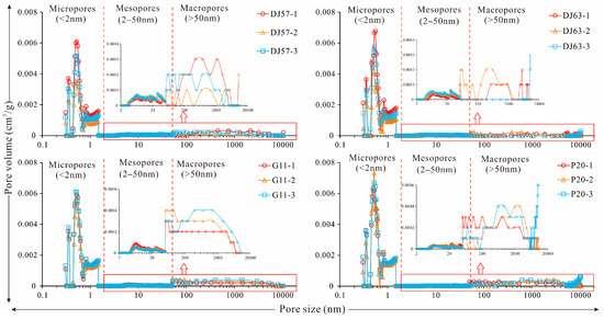 The PV and SSA values for the coal samples from the Benxi Formation in the study area, along with the pore size distribution curves, are shown in Figure 3 and Figure 4. The trends within different pore size segments exhibit distinct differences. For pore sizes greater than 30 nm, the increases in the PVs and SSAs are relatively minor, indicating fewer macropores. When the pore sizes are below 30 nm, there are notable transformations in the PVs and SSAs, with multiple peaks observed. This indicates a sharp increase in the quantity of mesopores. Nanoscale pores are developed primarily within the coal samples from the study area [49,50]. The HPMI results are summarized in Table 2, in which the pore structure parameters (PV and SSA) and pore size distribution curves in the range of 3 nm to 10 µm are calculated on the basis of the Washburn equation via HPMI data (Table 2) [46]. The PVs of the Benxi Formation coal samples in the study area range from 0.018 to 0.059 cm3/g (with a mean of 0.035 cm3/g). The SSAs of the pores in the coal samples of the Benxi Formation range from 10.09 to 32.37 m2/g (with a mean of 18.67 m2/g). Among them, the coal sample from well DJ57 has a larger PV and SSA, and the coal sample from well P20 has a smaller PV and SSA, which means that the coal sample has a lower degree of metamorphism and more developed macropores.