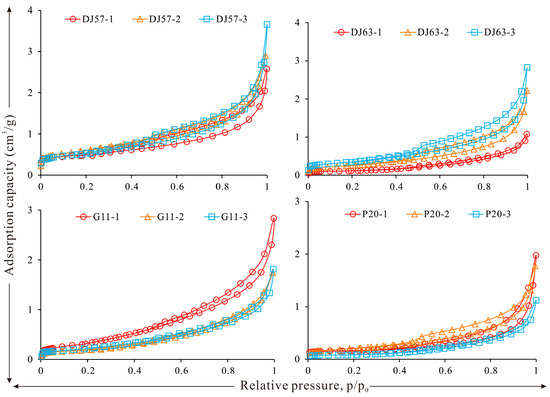 The characteristics of the hysteresis loop can offer valuable insights into the pore structure [51,52,53]. The adsorption aggregation theory posits that varying relative pressures within the same pore can result in the emergence of a hysteresis loop between the branches of adsorption and desorption. This is primarily caused by the complex combination of different pore geometries [19]. According to the IUPAC classification of hysteresis loops [14], the hysteresis loops of the coal samples in the study area are primarily Type H3. When the relative pressure is low (p/p0 < 0.5), the adsorption and desorption curves essentially overlap, indicating that the pore types are mainly cylindrical, conical, and slit-shaped. When p/p0 is high, there is a slight hysteresis loop, suggesting the presence of open pores.