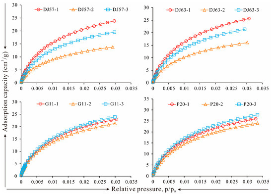 Owing to the high energy and rapid equilibration of CO2 molecules at 273 K, CO2 can enter smaller pores, particularly those exhibiting diameters smaller than two nm, which provide a significant portion of the storage space for the absorbed gas. As shown in Figure 8, the LPCO2A isothermal adsorption curves of the Benxi Formation coal samples in the study area are highly similar to the Type I isotherms in the IUPAC classification [14]. When the relative pressure reaches its maximum value, the CO2 adsorption isotherm does not plateau. This is primarily because the Benxi Formation coal samples in the study area generally contain many micropores, which may have similar pore size distribution characteristics. At relative pressures (p/p0) below 0.01, the rapid adsorption of CO2 molecules on the micropore surfaces leads to a swift elevation in the adsorption capacity. As the relative pressure continues to increase, the rates of increase in adsorption and total adsorption gradually decrease; this indicates that the micropores in the coal samples are filled with CO2 molecules, and when the test pressure approaches atmospheric pressure, the adsorption capacity stabilizes, corresponding to the saturation adsorption volume being equal to the filling volume of the micropores. The adsorption capacities of different coal samples vary due to their different maturities. For example, the CO2 adsorption capacity of the coal sample from the P20 well is significantly greater than that of the samples from the DJ57, DJ63, and G11 wells, suggesting that the number and degree of development of micropores in the coal samples in the study area may be related to the degree of metamorphism.