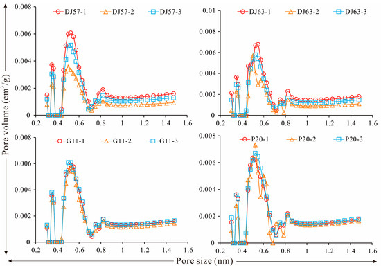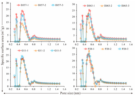 In the NLDFT model, the pore size distribution curves and pore structure parameters of the coal samples in the pore size range of 0.3 to 1.5 nm were obtained from LPCO2A data (Table 2) [42,43]. The DFT SSA values range from 143.64 to 275.76 m2/g (with a mean of 226.94 m2/g), which are significantly greater than the results from the LTN2A analysis. This suggests that the coal samples possess a larger fraction of micropores. The DFT PV values derived from the CO2 adsorption isotherms range from 0.042 to 0.081 cm3/g (with a mean of 0.067 cm3/g). The average pore diameters range from 0.501 to 0.524 nm (with a mean of 0.513 nm). Based on the micropore pore size distributions obtained from CO2 isothermal adsorption measurements (Figure 9 and Figure 10), the micropores in the samples generally exhibit distributions with multiple peaks, with peaks at approximately 0.3–0.4 nm, 0.4–0.7 nm, and 0.7–0.9 nm; this suggests a broad range of micropore distributions in the coal samples, with pore diameters of 0.36 nm, 0.52 nm, and 0.82 nm corresponding to the main peaks.