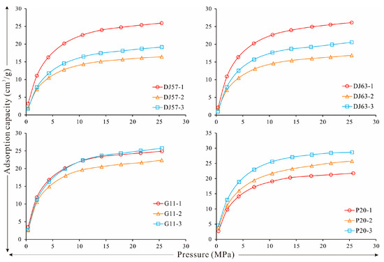 Isothermal adsorption experiments involving high-pressure methane were performed on coal samples from the Benxi Formation in the study area, utilizing the gravimetric method. The methane adsorption amounts at different pressure points were fitted and analysed via the Langmuir equation, resulting in methane isothermal adsorption curves and Langmuir parameters (VL and PL). The experimental results are shown in Figure 11 and Table 3. The VL values (equilibrium water-based parameters) of the Benxi Formation coal samples in the study area range from 18.44 to 32.28 cm3/g (with a mean of 25.72 cm3/g). The PL values range from 2.66 to 3.79 MPa (with a mean of 3.22 MPa). The average VL values of the coal samples from wells P20 and DJ57 are 28.46 cm3/g and 23.22 cm3/g, respectively. With increasing Ro,max values, the adsorption capacities of the Benxi Formation coal samples increase. These findings indicate that the Benxi Formation coal samples in the study area have an elevated VL, which is favourable for methane adsorption, and a low PL, which is unfavourable for methane storage. Coal has many adsorption sites on the internal surfaces of its pores and has a strong adsorption affinity for CH4 molecules [28,54,55,56,57]. Even at low gas pressures (<15 MPa), the methane adsorption capacity of coal increases rapidly, resulting in a steep isothermal adsorption curve. As adsorption progresses, the number of remaining adsorption sites in coal decreases continuously, leading to a relatively slow increase in methane adsorption. At higher pressures (>15 MPa), the isothermal adsorption curve increases more gradually.