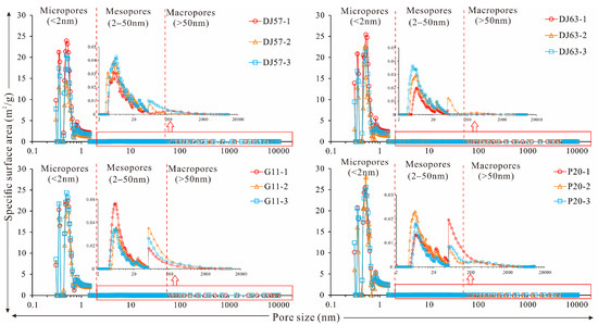 Figure 6 shows that the range of PVs for the coal samples in the study area exhibits a distinct multipeak feature with respect to the pore diameters, with the main peak regions primarily distributed in the pore diameter ranges of 1.06–1.5 nm and 5–10 nm, with the highest peak located in the 5–10 nm pore diameter range. When the pore diameters exceed 10 nm, the range of PVs is small. Figure 7 presents the range of pore SSAs of the coal samples in the study area as a function of the pore diameter. Like the distribution of PVs, some coal samples also present distinct multipeak features in the distribution of pore SSAs, with the main peak regions occurring primarily in the 1.06–1.5 nm and 5–10 nm pore diameter ranges. The coal sample from the G11 well exhibited a unimodal distribution, with overall pore diameters ranging between 5 nm and 10 nm and a main peak at approximately 6 nm.