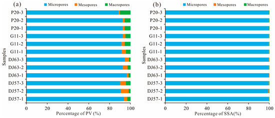 According to the results of the combined characterisation of the PV distribution with the pore diameters for the Benxi Formation coal samples from the study area (Figure 13), the PV distribution type is predominantly unimodal with micropore dominance. The pore size distribution shows the micropores are unimodal and are primarily concentrated within the span of 0.3 to 1.5 nm. According to Table 4 and Figure 15a, the overall PVs of the Benxi Formation coal samples in the study area range from 0.046 to 0.092 cm3/g, with an average of 0.073 cm3/g. Micropores contribute most to the PV, followed by mesopores and macropores, which contribute less. Micropores primarily occupy a pore size range of 0.3 to 0.7 nm, with micropore PVs ranging from 0.042 to 0.081 cm3/g (with an average of 0.068 cm3/g), accounting for 88.94% to 96.71% of the total PV (with an average of 92.46%). Mesopores and macropores follow, with mesopores in the 5 to 10 nm pore size range and with volumes ranging from 0.001 to 0.004 cm3/g (with an average of 0.002 cm3/g), which constitute 1.23% to 7.53% of the total PV (with an average of 3.48%). Macropores, which are primarily composed of pores larger than one μm, have volumes ranging from 0.001 to 0.009 cm3/g (with an average of 0.003 cm3/g), accounting for 1.16% to 9.83% of the total PV (with an average of 4.06%).