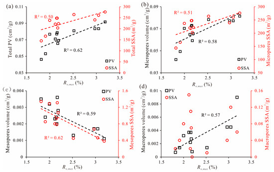 Relationships between Ro,max and total PV and SSA (a), micropore PV and SSA (b), mesopore PV and SSA (c), and macropore PV and SSA (d).