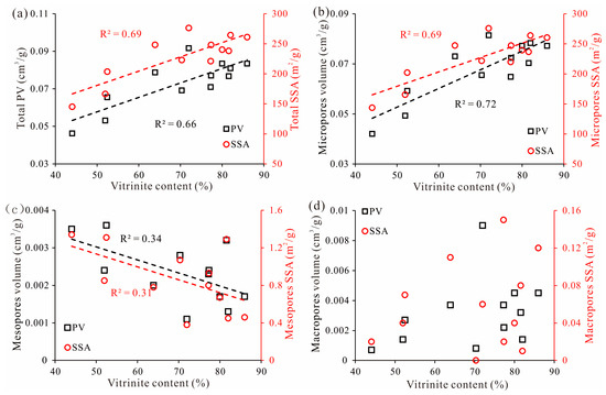 Relationships between vitrinite content and total PV and SSA (a), micropore PV and SSA (b), mesopore PV and SSA (c), and macropore PV and SSA (d).