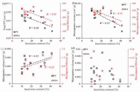 Relationships between inertinite content and total PV and SSA (a), micropore PV and SSA (b), mesopore PV and SSA (c), and macropore PV and SSA (d).