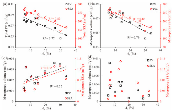 Relationships between Ad and total PV and SSA (a), micropore PV and SSA (b), mesopore PV and SSA (c), and macropore PV and SSA (d).