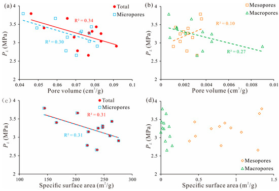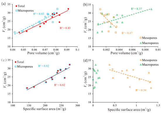 Relationships between the VL and total PV and micropore PV (a), mesopore PV and macropore PV (b), total SSA and micropore SSA (c), and mesopore SSA and macropore SSA (d).