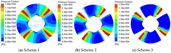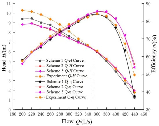 - Under low flow conditions, the head of Scheme 2 and Scheme 3 decreases compared to Scheme 1, but the efficiency difference is not significant. Under design conditions, Scheme 2 and Scheme 3 have increased efficiency by 1% compared to Scheme 1. Under high flow conditions, there is not much difference in the head of each scheme. Scheme 2 and Scheme 3 have increased efficiency compared to Scheme 1, and have expanded the operating range of the high-efficiency zone of the axial flow pump.