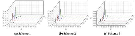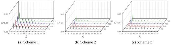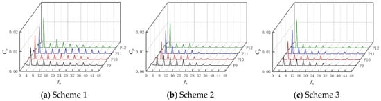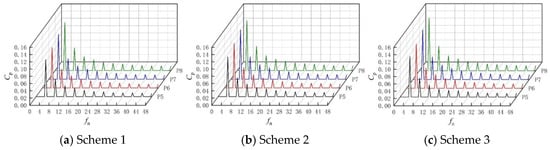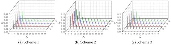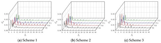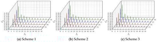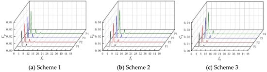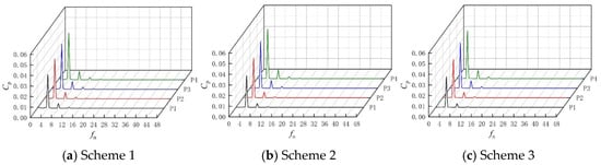 - The amplitude of pressure pulsation at the monitoring points in the middle section of the impeller is greater than that at the inlet and outlet, because the pressure pulsation at the middle section of the impeller is mainly affected by the pressure difference between the front and back of the blade. The main frequency of pressure pulsation amplitude at monitoring points of different sections of the impeller is the blade frequency, which is four times the rotational frequency. This lightweight axial flow pump (Scheme 2 and Scheme 3) has a lower pressure pulsation amplitude at the impeller outlet monitoring point under large flow conditions. After the lightweight design of the axial flow pump impeller, the blade becomes shorter, the mass becomes lighter, and the cavitation performance will become worse.