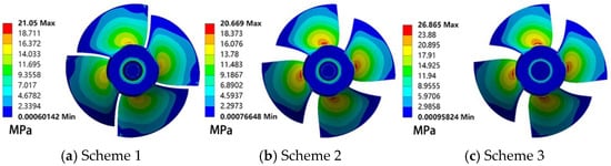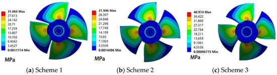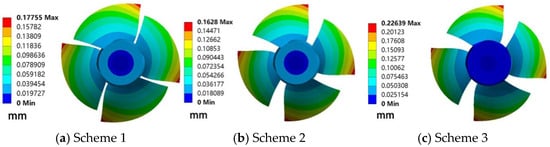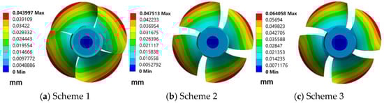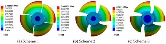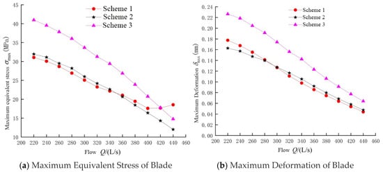 - The maximum equivalent stress and maximum deformation of axial flow pump blades gradually decrease with the increase in flow rate. The maximum equivalent stresses for Scheme 1, Scheme 2, and Scheme 3 are 31.065 MPa, 31.946 MPa, and 40.974 MPa, and the maximum deformations are 0.178 mm, 0.163 mm, and 0.226 mm, respectively. The maximum equivalent stress of Scheme 2 and Scheme 3 increased by 2.8% and 31.9%, respectively, compared to Scheme 1. The maximum deformation of Scheme 2 decreased by 8.4% compared to Scheme 1, while the maximum deformation of Scheme 3 increased by 27% compared to Scheme 1. This shows that when the blade thickness is unchanged, changing the blade length has little effect on the maximum stress and strain of the impeller, but reducing the thickness of the blade will make the structural characteristics of the impeller become very poor. All schemes can meet the safety requirements of blade structure.