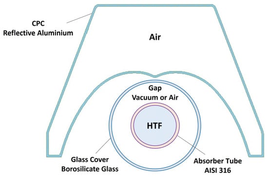 This section describes the PTC and the LFC systems considered in this study. As a reference system for the PTC, one line of collectors with an aperture width of 5.9 m and a receiver tube with the external diameter of 0.07 m and total length of 800 m were considered, while for the LFC, 10 rows of parallel mirrors with an aperture width of 0.625 m each and a receiver tube with an external diameter of 0.07 m, a secondary concentrator of CPC type and a total length of 800 m were assumed [,,,,]. The chosen values for the main geometric and optical parameters of the solar field are provided in Table 1 for both technologies. Figure 1 displays the scheme of the cross section of the receiver unit adopted in the LFC, including the materials for the different components. The secondary concentrator was a Compound Parabolic Concentrator (CPC). The absorber tube was made of a metallic material, encapsulated in a glass cover to reduce both convective and radiative thermal losses. The gap region between the absorber tube and the glass tube could be kept either under vacuum conditions (10−2 Pa), to enhance thermal insulation, or it could be simply filled with air at the atmospheric pressure. The absorber tube transferred the energy of the concentrated solar radiation to the HTF, which was molten salt (60%wt. NaNO3 + 40%wt. KNO3 []) in this study. In order to make the comparison between the PTC and the LFC as fair as possible, the same operating temperature of the HTF was considered (290–500 °C).