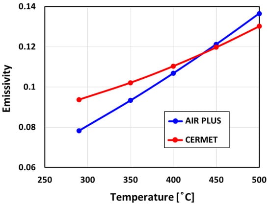A selective coating was applied on the outer surface of the absorber tube to improve its photothermal performance. Regarding the evacuated tube, a commercially established selective coating (CERMET) was considered []. For the non-evacuated tube, a selective coating (AIR PLUS) under development at ENEA, which was suitable for working in air, was adopted in this study. Table 2 represents the emissivity and absorptivity of these two coatings for the evacuated and non-evacuated tubes, and Figure 2 depicts the emissivity equations.