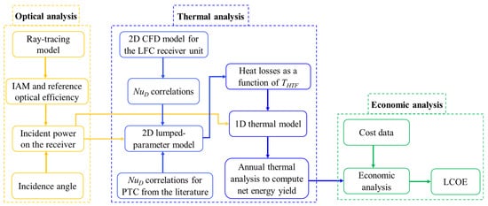 Figure 3 summarizes the methodology implemented in this study to compare the PTC and LFC technologies from optical, thermal and economic points of view. As shown in Figure 3, firstly, an optical ray-tracing model was developed using a ray-tracing code (Tonatiuh) to compute the incident angle modifier (IAM) and the reference optical efficiency for a given PTC or LFC plant (see Section 4). This model provided the solar power incident over the receiver, which was required for the thermal analysis by the lumped-parameter and 1D thermal models. Regarding the thermal analysis, initially, a 2D CFD model was developed to estimate the convective heat losses (see Section 5.3) in the case of the LFC receiver unit. In fact, the presence of the secondary concentrator made the development of this model necessary to evaluate the convective heat transfer between the glass cover and the environment as it could be approximated by adopting correlations available in the literature (e.g., suitable for cylinders in cross flow) only in the case of the PTC. The results of the CFD model in terms of the Nusselt number were exploited by a steady-state lumped-parameter model, developed in the radial direction by the Modelica language. The lumped-parameter model aimed at computing the heat transfer phenomena along the radial direction for a given incident solar heat flux, HTF temperature, mass flow rate, ambient temperature and (transversal) wind speed (see Section 5.2). This model calculated the heat losses from the absorber tube toward the environment for any given temperature of the HTF. The computed functions of heat losses were then exploited by the 1D thermal model, developed along the axial direction, to solve the energy balance of the heat transfer fluid, considering the hourly ambient temperature, wind speed and DNI data for the whole year (see Section 5.1). Therefore, the net annual energy yield could be calculated by the 1D model to be used in the economic analysis. To perform a comparative economic analysis based on the LCOE (see Section 6), the cost data were also required in addition to the net annual energy yield. In the present work, these cost data were collected from the literature.