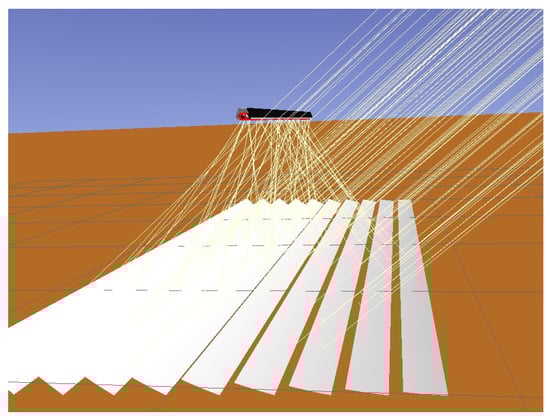 In order to determine the IAM components, as well as the reference optical efficiency, a ray-tracing model was developed using Tonatiuh [] for both the LFC and PTC, which could compute the incident power on the absorber tube for any given Sun position. The model was based on the geometric and optical properties in Table 1, except for the collector length, which was shortened to 20 m, while the receiver was 10 m long and translated along the axial direction, depending on the Sun’s position, to keep the absorber tube in the irradiated area. This allowed for the removal of any border effect, which was not taken into account in the IAM since it was considered in Equation (2). Figure 4 shows an example of the simulated solar system visualized in Tonatiuh.