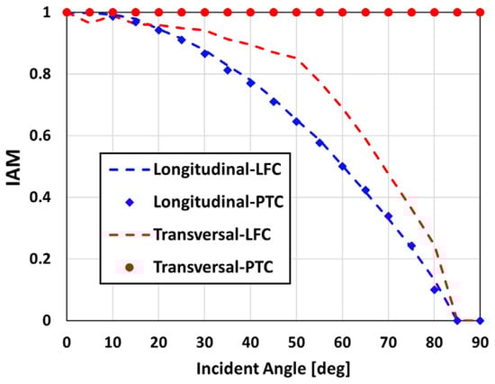 The reference optical efficiencies (Sun at zenith) computed using the ray-tracing model were equal to 0.839 and 0.878 for the LFC and the PTC, respectively. As expected, the efficiency was lower for the LFC because it only approximated a parabolic collector. A set of simulations was performed to evaluate the and , considering the Sun belonging to the collector longitudinal and transversal plane, respectively, and varying the Sun’s altitude. Figure 5 shows the computed IAML and the IAMT as a function of the incidence angle for both the technologies. For the PTC, the transversal component of the IAM was equal to 1 independently by the incidence angle, which arose from the fact that, in the PTC collector, the solar rays were always in the same plane as the normal vector to the aperture.
