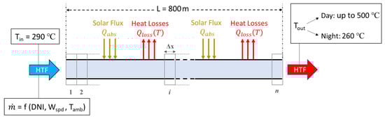 Figure 6 provides a schematic representation of this model. The required boundary conditions included the HTF inlet temperature and the net thermal power transferred to the fluid per unit of receiver length, which corresponded to the absorbed heat flux (computed through the incident heat flux provided by the optical model, see Section 4) net of the heat losses (provided by the lumped-parameter model, see Section 5.2). During the night, a minimum outlet temperature of 260 °C was imposed to keep the molten salt 20 °C higher than the freezing point [], and accordingly, the minimum mass flow rate was calculated to satisfy this outlet temperature. However, during the daytime, the HTF outlet temperature could increase up to 500 °C and the mass flow rate had to be regulated based on the DNI, wind speed and ambient temperature (which was proven to be highly dependent on the DNI). In this regard, once the DNI (and consecutively absorbed heat flux) started increasing, first, the HTF outlet temperature increased to reach the maximum outlet temperature of 500 °C, and then, the mass flow rate was regulated based on the variation in the DNI. Therefore, in cases of seasonal fluctuations or transient impacts like cloud cover, which resulted in low DNI values, the HTF outlet temperature could not reach 500 °C, while the mass flow rate was considered to remain equal to the setpoint value. The mass flow control strategy based on DNI included a few steps: first, the energy balance equation (Equation (5)) was applied for the entire receiver tube as a single control volume considering the absorbed solar power, mean heat loss and the receiver inlet/outlet temperatures, which provided an initial estimate for the mass flow rate. Then, this first guess for the mass flow rate was exploited by Equation (5) with the spatial discretization of the pipe to compute the required receiver length, ensuring the desired temperature increase of the HTF (290–500 °C). The deviation between the computed length and the design receiver length (800 m) was utilized to refine the mass flow rate evaluation. This procedure was iterated by computing the new receiver length using the updated mass flow rate value and continued until the computed receiver length was equal to the design value, indicating the accurate mass flow rate for the given DNI. Due to the appropriate initial estimate, three iterations were mostly enough to achieve the convergence in this approach. Regarding the space discretization, the receiver axis was divided in 160 control volumes of equal length, , equal to 5 m. The grid independence of the results was verified.