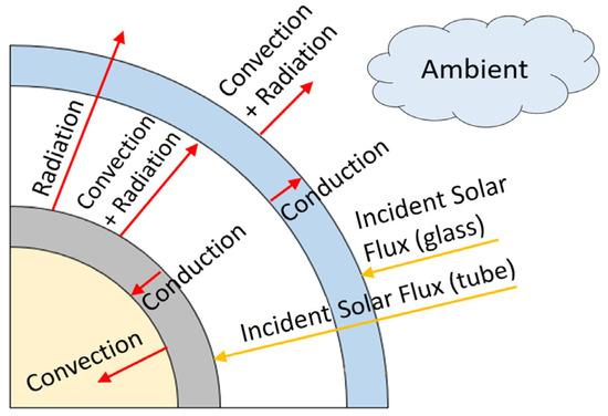 As given in Equation (5), the 1D thermal model relied on the absorbed heat flux per unit length () and the heat losses per unit length (). While the former could be obtained by converting the incident power on the receiver tube given by the optical model (see Section 4), the latter had to be determined as a function of the HTF temperature through a lumped-parameter model developed in the radial direction of the receiver tube, which is represented subsequently in Section 5.2.