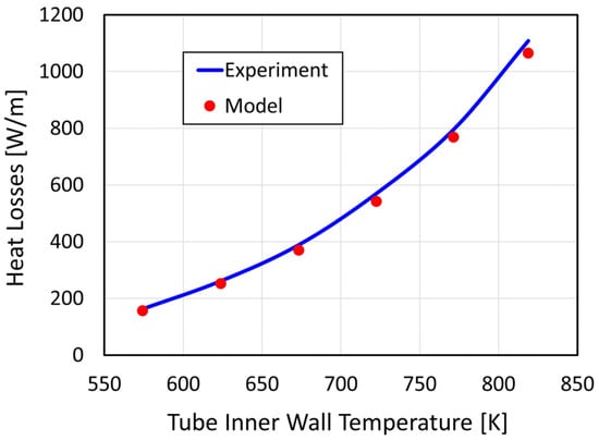 The lumped-parameter model was validated against the experimental data provided by ENEA for the SCHOTT PTR®70 receiver tube []. The experiment was conducted at the ENEA Casaccia laboratory. In this test, a receiver tube with a length of about 4 m was heated by the Joule effect until it reached a practically uniform tube temperature (Figure 8). At this point, the heat loss toward the environment was measured, which was equal to the electrical power to be provided to keep the tube at the desired temperature. The inner wall temperature was measured by nine thermocouples arranged on the inner wall of the tube. As shown schematically in Figure 8, three thermocouples were located about 40 cm from the end of the tube, while the other three were located about 25 cm from the opposite end, and the last three thermocouples were located at the center of the receiver tube. The thermocouples were arranged with an angular distance of 120° among them. Both ends of the tube were closed in order to avoid air replacement inside the tube.