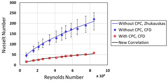 Figure 11 compares the Nusselt numbers obtained by the CFD model and by the Zhukauskas correlation for different Reynolds numbers, which were obtained for different combinations of the parameters. The obtained range of the Reynolds number covered the entire range in which the correlation was applicable. As shown, the model reproduced the Nusselt number values predicted by the correlation well. The maximum deviation was 9.49%, which was sufficiently convincing, since the error bar for the correlations was about 20% (as shown in Figure 11), according to [].