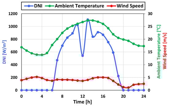 Meteorological data including the DNI, wind speed and ambient temperature for the reference location (Karas, Namibia) and the reference day (13 November).