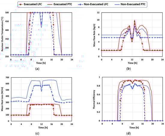 Thermal performance of the different configurations considering the reference day (13 November) in terms of the (a) receiver outlet temperature, (b) mass flow rate, (c) mean heat loss and (d) thermal efficiency.