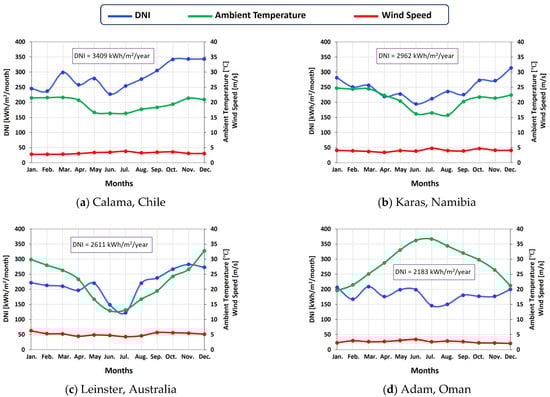 Moving to the annual-based comparison, Figure 14 shows the monthly values of the meteorological data for each of the reference locations, namely, Calama (Chile), Karas (Namibia), Leinster (Australia) and Adam (Oman), during the year (data from []). As shown, the location in Chile had the highest yearly solar direct beam potential with 3409 kWh/m2, while the lowest yearly potential corresponded to the location considered in Oman, with 2183 kWh/m2. The latitudes of the aforementioned locations were the following: Calama (Chile) was located at 22.49° S, Karas (Namibia) at 25.63° S, Leinster (Australia) at 27.79° S and Adam (Oman) at 22.51° N. For each location, hourly meteorological data comprising the DNI, wind speed and ambient temperature were considered to calculate the annual energy yield by means of the 1D model.