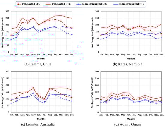 Figure 15 displays the net monthly energy yield during the year calculated for the reference locations considering different configurations. Considering the N–S alignment of the receiver tube, during the summer, the collectors are exposed to extended duration of the sunlight with a high transversal angle early in the morning and late in the afternoon. Consequently, the optical performance of the LFC is dramatically influenced in this period, despite the PTC that remains unaffected by this factor (see Figure 5). As a result, the PTC performance is much more efficient at the beginning/end of the year for the locations in the southern hemisphere, as shown in Figure 15. However, for the location in Oman, closer to the equator, smaller variations in daytime duration throughout the year results in a more balanced ratios of PTC/LFC in terms of the net monthly energy yield. Moving to the comparison of the evacuated and non-evacuated tubes for each individual technology (PTC or LFC), identical patterns of variations can be observed throughout the year for both configurations, regardless of the location. This is because the difference in the thermal performance remains almost constant owing to the same patterns of wind speed throughout the year (see Figure 14).
