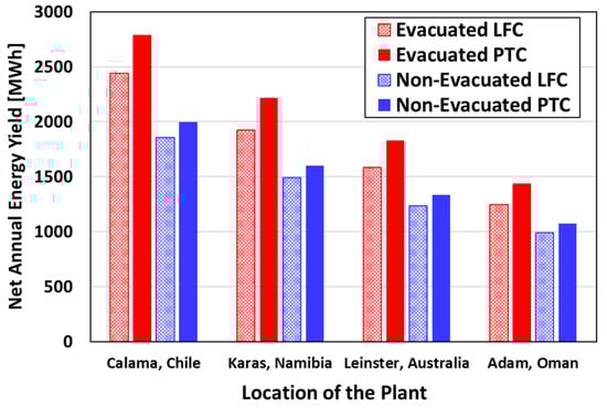 Figure 16 outlines the net annual energy yields for the reference locations and for the different configurations. As expected, the evacuated tube allowed for a higher net energy yield to be reached compared to the non-evacuated tube because of the higher thermal efficiency for the evacuated case. This higher efficiency was due to the lower heat losses ensured by the evacuation. This result applied to both the PTC and LFC technologies, independent of the location. The PTC generated higher energy in both evacuated and non-evacuated cases thanks to the better optical efficiency in comparison with the LFC. In fact, the parabolic shape of the PTC resulted in a more efficient optical design by focusing sunlight more effectively onto the receiver tube, compared to linear mirrors of the LFC. However, the benefit of the PTC with respect to the LFC was lower than the performance improvement obtainable using an evacuated tube instead of a non-evacuated one. Moreover, the contrast in the net annual energy yield generated by the PTC and by the LFC was less noticeable when considering the non-evacuated tubes in comparison with the evacuated tubes for each location. This is because the LFC receiver tube was protected against the wind by the secondary concentrator; thus, it was less sensible to convective heat losses, which instead strongly penalized the PTC without the thermal insulation provided by the vacuum. Comparing different locations revealed that the ratio of the net annual energy yield generated by the non-evacuated tube to that generated by the evacuated tube remained unaffected by the location (approximately 0.72 for the PTC). In fact, due to the relatively identical wind speed for all the locations throughout the year (Figure 14), the difference between the two configurations in terms of the thermal performance was not influenced by the location. Similarly, the ratio of LFC/PTC in terms of the net annual energy yield remained almost unchanged across the locations (approximately 0.86) due to the absence of variation in the proportional optical performance. In addition, the net annual energy yield followed the trend of the available yearly DNI (Figure 14), as expected.