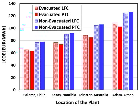 Subsequently, an economic analysis was performed based on the LCOE, exploiting the net annual energy yield computed for each location by the thermal model and considering the cost data collected from the literature. It was found that the PTC system led to a lower LCOE in the case of the evacuated tubes, with the lowest LCOE of EUR 63.4/MWh for the highest DNI location (in Chile), as the higher capital cost of the evacuated PTC was compensated by the higher optical efficiency, which is in agreement with the previous findings available in the literature. However, the non-evacuated LFC represented a slightly lower LCOE compared to the non-evacuated PTC for various locations, since the lower capital cost of the non-evacuated LFC outweighed its lower net annual energy yield. Additionally, the evacuated tubes demonstrated lower LCOEs compared to the non-evacuated tubes.