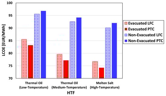 As mentioned in Section 2, molten salt was considered as the HTF in this study with an operational temperatures of 290–500 °C. However, linear CSP systems may operate at lower temperatures as well. By reducing operating temperatures, the thermal insulation provided by an evacuated tube should impact thermal efficiency progressively less; in fact, heat losses depend on the temperature of the HTF. Therefore, the non-evacuated tube technology may have had a better LCOE than the evacuated tube case for sufficiently low temperatures. In this respect, a sensitivity analysis based on the HTF temperature was performed to identify the impact of this parameter on the LCOE. Hence, the reference plant with molten salt was compared with two other cases: a medium-temperature plant with thermal oil (Therminol VP-1) as the HTF operating at the temperatures of 290–400 °C and a low-temperature plant with thermal oil (DelcoTerm Solar E15) as the HTF operating at the temperatures of 180–300 °C. The power cycle efficiencies for the Rankine cycle were considered to be 35% and 31% for the medium-temperature and low-temperature plants, respectively [,].