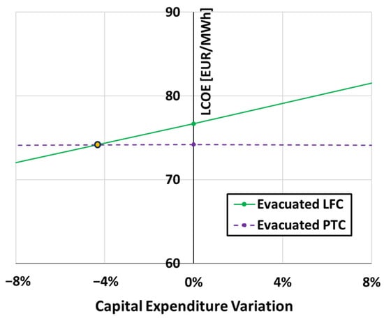 Sensitivity analysis representing the impact of the capital cost on equalizing the LCOE for the LFC and the PTC.