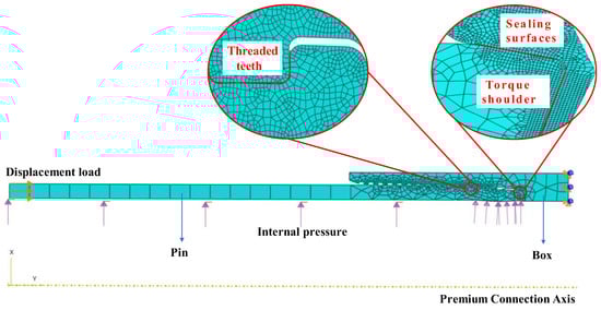 Figure 5 shows the element model of a cone–cone Φ88.9 mm × 6.45 mm P110 premium connection. The sealing surface taper was 1:2, the thread was a partial trapezoid, and the thread taper was 1:16. The interference between the coupling and the sealing surface of the tubing was 0.115 mm, the friction coefficient was 0.02, the material elastic modulus E was 2.06 × 105 MPa, the Poisson’s ratio was 0.3, and the material yield strength was 758 MPa. The sealing surface, engaging threads, and torque shoulder were set up as contact pairs. The boundary conditions of the simulated downhole conditions are shown in Figure 5. Pressure P was applied to the inner wall of the tubing and the hoop, and the X-direction constraint was applied to the right end of the hoop; the axial cyclic displacement load x was applied to the left end of the tubing.